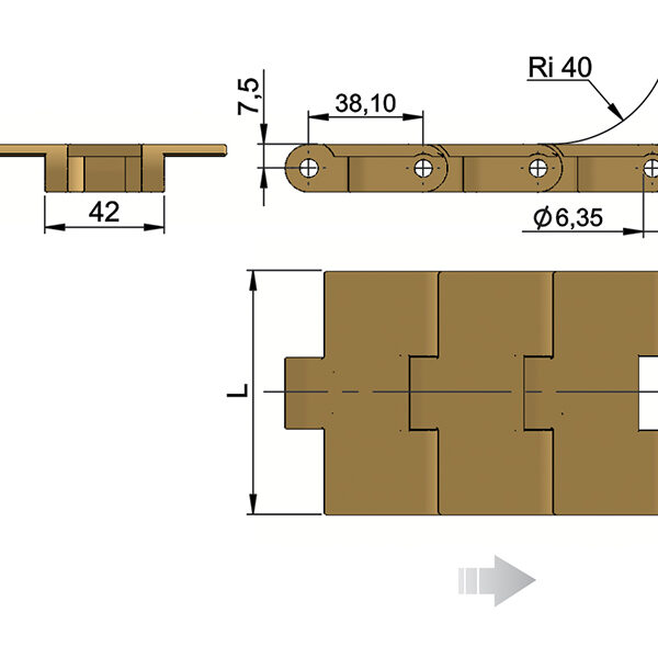 Seu passo é de 1.1/2” (38,1mm), boa capacidade de carga, tendo como limite a carga de até 220Kg. Este modelo pode ser fabricado em POM, PP, WUH, podendo ser fabricado em outros materiais sobe consulta. Sua dobradiça de união tem a largura padrão de 42,1mm.