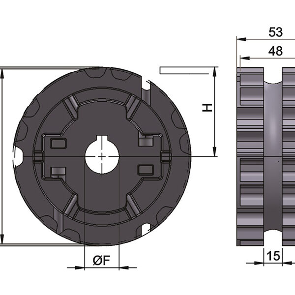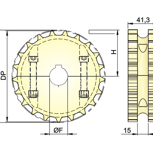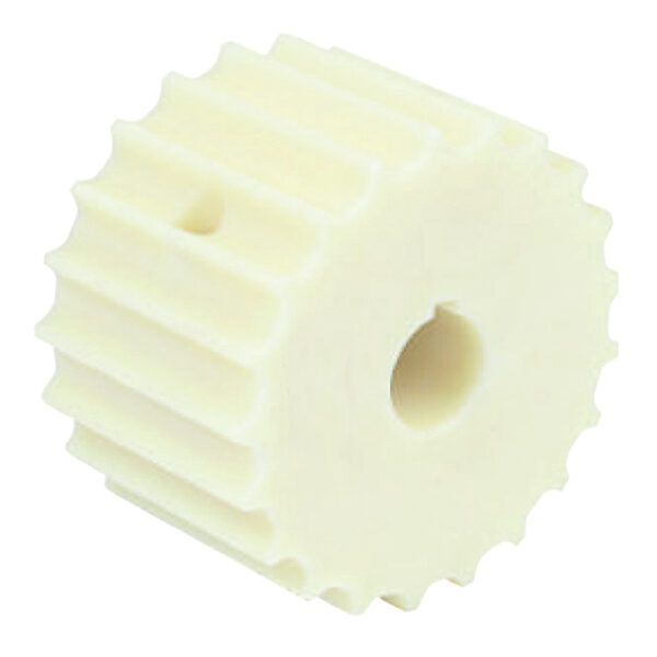 Engrenagens usinadas em nylon, com 9, 10, 11 e 12 dentes, diâmetro do furo de 25 a 40mm. São bipartidas com fixação por parafusos. Tem códigos para modelos com e sem chaveta.