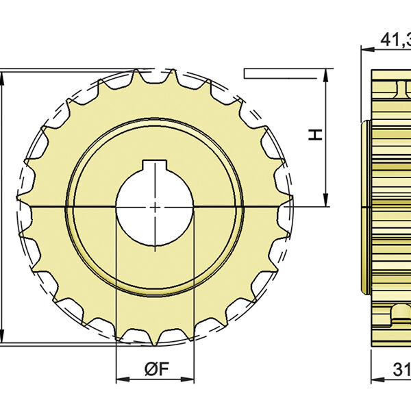 Engrenagens usinadas em nylon, com 17, 19,21, 23, 25, 27 e 29 dentes, diâmetro do furo de 25 a 40mm. São bipartidas com fixação por parafusos. Tem códigos para modelos com e sem chaveta