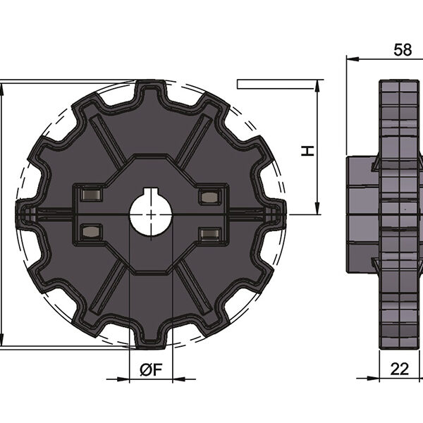 Engrenagens injetadas em nylon com fibra, com 10 e 12 dentes, diâmetro do furo de 25 a 40 mm com códigos para modelos com e sem chaveta.Tem códigos para modelos com e sem chaveta.